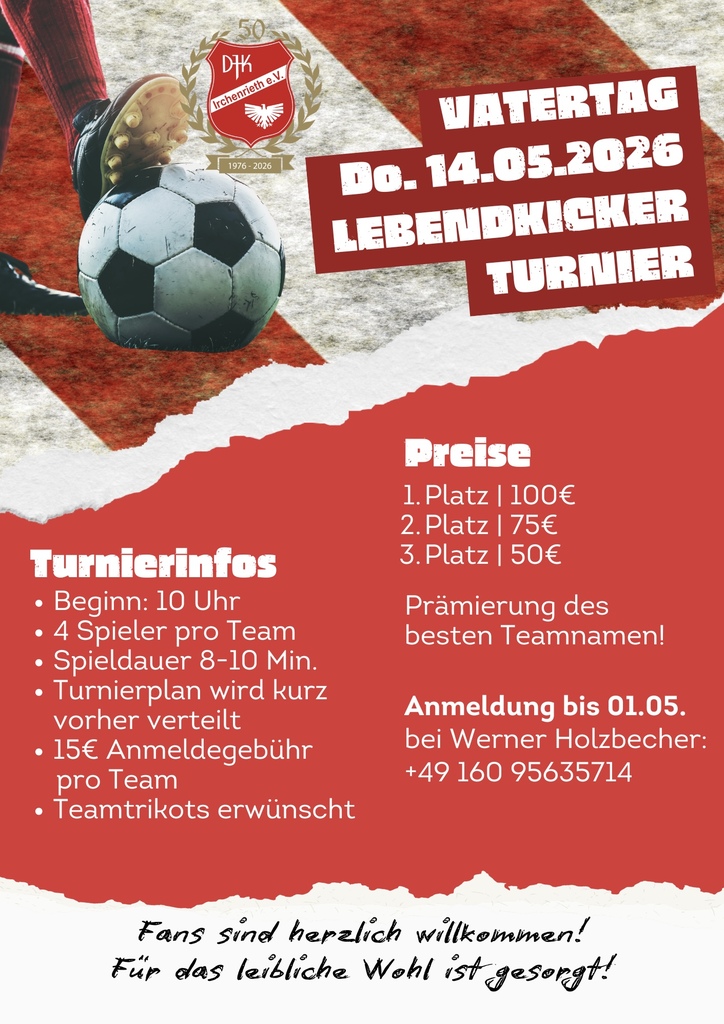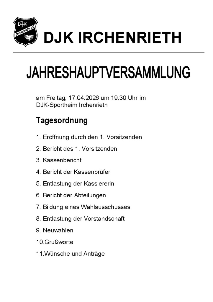 Herzlich willkommen bei der DJK Irchenrieth News / Termine Jahresmitgliederversammlung mit Neuwahlen am Freitag, 17. April 2026, Beginn 19.30 Uhr Tickets Kurse in der DJK-Mehrzweckhalle in Irchenrieth Kursangebote Stand: März 2025 Junioren-Fußball bei der DJK Junioren Unsere Abteilungen: Fussball 1. Mannschaft (Kreisklasse Ost)2. Mannschaft7 Junioren-Mannschaften Tennis 1 Junioren-Mannschaft1 Damen2 Damen 401 Herren 40 Gymnastik Vielseitige Kursangebote Linedance Eisstock Mitglied werden